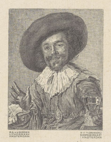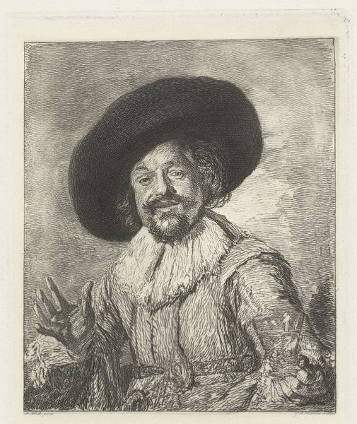Léopold Flameng created this etching, "Vrolijke drinker," capturing a jovial drinker. At its heart, the image revolves around the simple yet potent motif of the raised glass, a gesture seen across centuries. Think of the ancient Roman frescoes depicting symposiums or the medieval tavern scenes, the raised glass appears as a symbol of camaraderie and celebration, of course, but also release. Consider how this motif has shifted. In Renaissance paintings, a goblet might signify abundance and pleasure, but also excess. Here, Flameng's figure, with his wide-brimmed hat and elaborate ruff, raises his glass with a direct, engaging gaze. It suggests an invitation, a call to partake in the moment's joy. This act transcends mere drinking; it's an embrace of life's fleeting pleasures, a defiance against the weight of existence. This image speaks to our collective memory of shared experiences and the primal urge to connect through celebration. The symbolism of the drinking glass reminds us of the non-linear path of symbols that carry history, emotion, and cultural memory.