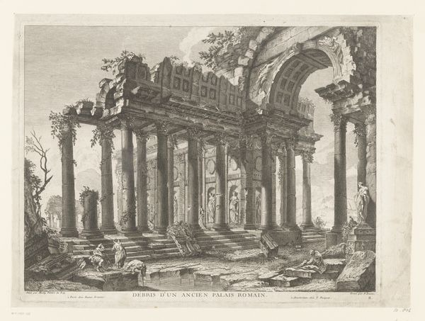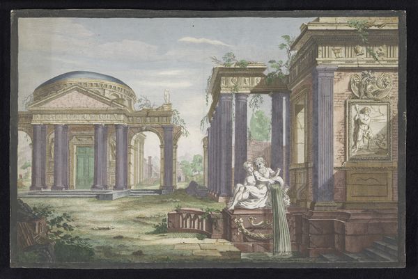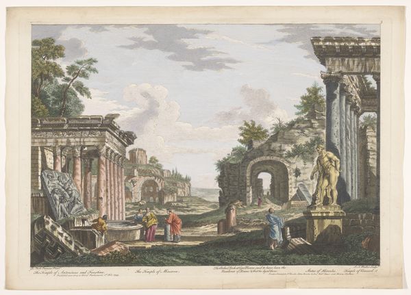 Editor: This is “View of the Ruins of the Temple of Hercules Invictus, the Temple of Portunus, and other monuments in Rome," an engraving with watercolor, possibly from 1753, by Robert Sayer. It's a really lovely scene, though quite… orderly, even for ruins! What do you see in this piece? Curator: I see an idealized vision of Rome, one that's steeped in the politics of the era. Neoclassicism was rising, fueled by Enlightenment ideals, but also colonial power. How do you think this image might participate in a larger narrative? Editor: Well, the style definitely echoes the glory of antiquity, maybe suggesting that current European powers are inheritors of that legacy? It almost romanticizes this colonial vision of ancient grandeur… Curator: Exactly! It invites us to think critically about whose gaze is privileged here. The very act of depicting these ruins as beautiful and ordered contributes to a particular narrative about power and cultural ownership. Do you see any contemporary parallels in the art world? Editor: I guess it reminds me of contemporary debates about representation, like museum collections reflecting colonial legacies and ongoing power imbalances… So even landscape prints like this one are part of those same discussions? Curator: Precisely. This piece helps us challenge what we consider ‘neutral’ or ‘objective.’ It reflects not only architectural ruins, but also the ruins of empires, both past and present. Editor: I never thought about landscape prints this way! It's like each one is quietly making an argument. Curator: Indeed. Looking closely reveals that landscapes aren’t passive scenes, but active participants in cultural conversations.