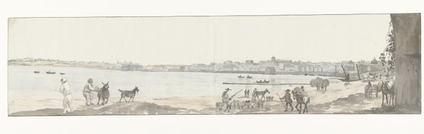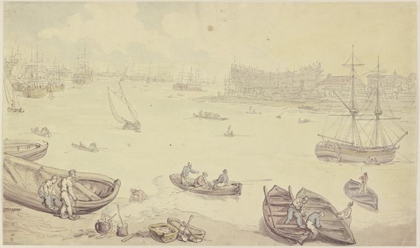 Editor: This is "Militia Drilling," a watercolor painting by William P. Chappel, made around 1870. It's a pretty understated scene, a muted landscape. What do you see in this piece? Curator: I see a powerful commentary on national identity and the lingering anxieties of post-Civil War America. Think about it – a genre scene, rendered in watercolor, depicting militia practice. It appears calm, but the presence of the armed men implies a society still grappling with the divisions and traumas of recent conflict. Who are these men training to fight, and who are they protecting themselves from? Editor: So, you think the "genre painting" style clashes with the implied meaning? Curator: Precisely. Genre paintings usually depict scenes of everyday life, often with a lighthearted or sentimental tone. But here, the mundane act of "drilling" masks a deeper unease. The landscape style is interesting as well – it shows how patriotic activities intertwine with ownership and stewardship of the land. Consider the historical context – 1870. Reconstruction was underway, fraught with tension and resistance. What do the almost hazy details of the landscape contribute to this impression? Editor: It's a washed-out picture. Are you suggesting the "haze" hints at a deliberate avoidance, as if not wanting to show every detail plainly? Curator: It may certainly do that. It could point to a collective amnesia, or perhaps the attempt to erase the very real problems in America’s treatment of its own citizens and the contested narrative surrounding patriotism. We can interpret Chappel’s work through a critical lens, understanding it as a reflection of broader societal power dynamics. It encourages dialogue and asks us to think about who gets to shape our shared narrative of patriotism and sacrifice. Editor: Wow, I hadn't considered it that way at all. I mostly saw just a faded landscape! Thank you! Curator: It's about going beyond the surface! Every detail has the potential to unravel something meaningful, when considered through an intersectional perspective.