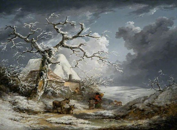 George Morland, a popular English painter, created this winter scene. The late 1700s saw significant shifts in English society, with evolving class structures and the rise of industrialization. Morland often depicted rural life, but not without a critical eye. Here, we see figures engaged in winter activities, yet the scene isn't purely celebratory. There’s a stark contrast: a cozy, snow-laden cottage stands as a backdrop to the exposed figures, suggesting a disparity in comfort and access. We are invited to consider how winter affects different social classes. The figures—are they enjoying leisure, or struggling to survive? Morland lived a tumultuous life, marked by financial instability and personal struggles, which may have influenced his nuanced portrayals of everyday life. Consider what this scene communicates about the realities of 18th-century rural England, and how Morland captures both its beauty and its hardships.