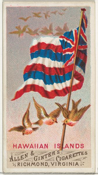 Editor: So, here we have an 1887 lithograph called "Pennant U.S., United States Jack," part of a series of "Flags of All Nations" produced by Allen & Ginter for cigarette cards. I’m struck by how this commercial item transforms the American flag into a collectible. What are your thoughts when looking at it? Curator: Well, the immediate thing I see is a collision of industry, labor, and national symbolism. This wasn’t high art, it was mass-produced. Lithography allowed for rapid dissemination, turning patriotism into a consumable item. The image becomes less about national pride and more about marketing cigarettes. Editor: That’s interesting. So, you’re focusing on the context of production. Does the symbolism of the flag change when it becomes a commercial tool? Curator: Precisely. Flags typically signify national identity, unity. But here, it signifies consumerism and capitalist expansion. Allen & Ginter were essentially selling dreams of aspiration alongside their tobacco, commodifying national identity in the process. Editor: So the materiality of the print, being a mass-produced object distributed with cigarettes, fundamentally alters its meaning? It's no longer purely patriotic, but inherently tied to industry and marketing? Curator: Absolutely. Consider the workers involved – from the lithographers producing the prints to the factory workers assembling the cigarette packs. The piece connects to wider questions about labor and the mechanisms through which national symbols were made commonplace, intertwined with everyday habits of consumption. What was initially propaganda morphs to promotion; these prints actively recruited subjects of commercial value rather than recruiting soldiers for the field. Editor: I see it now. Thinking about it this way opens up new interpretations of everyday objects. I had initially viewed it just as historical ephemera, but now I see a complex network of production and cultural meaning embedded within. Curator: Exactly, looking at art through its materials and means of production provides critical insights beyond surface appearances. It reveals underlying power structures, like marketing techniques or labor relationships, inherent to capitalism, consumption, and production.