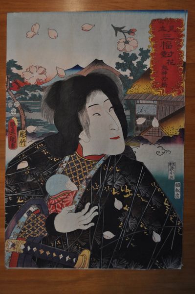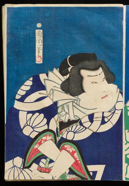 Curator: This is a woodblock print by Utagawa Kunisada, created around 1851. It's titled "(Lovers Hiding in Rain from an Unidentified Kabuki Play)" and it now resides at the Minneapolis Institute of Art. Editor: It feels both intimate and theatrical. I'm struck by the texture – that delicate line work giving the impression of falling rain, juxtaposed against the solid blocks of color in their clothing. Curator: Yes, Kunisada was a master of ukiyo-e, "pictures of the floating world." Think about the cultural significance of Kabuki theater in Edo-period Japan. This image isn't just a portrait, it's capturing a story, a mood, anxieties about love and honor... Editor: The colors draw me in: the pale skin tones set against the darker indigo and purple shades of their garments, there's even a kind of subtle luxury implied in those patterns. Considering the means of production - the wood carving process, the layering of inks- one can appreciate how demanding such color combinations could be for artisans. Curator: Indeed. Color symbolism was quite deliberate. Indigo could be associated with faithfulness or even sorrow. And don’t overlook that tiny bird caught mid-flight. Birds often symbolize freedom, escape... Is it a reflection on the characters or the feeling in the narrative itself? Editor: Good eye. Also consider the paper itself. The tactile quality of Japanese paper – "washi" – made from mulberry fibers. That choice contributes so much. The print medium democratizes art in a sense, making these images more accessible, commodities even, distributed widely through urban centers. Curator: Precisely! Think about these prints as cultural currency, visual records reflecting aspirations, anxieties, societal values related to the very popular entertainment culture. These images allow a deeper look into the human experience. Editor: Kunisada and the artisans behind him offer us a layered record. A glimpse of labor practices, of material availability and choices, as well as aesthetic and social context. Curator: It all goes together and is fascinating! I now see the performance is just the beginning to fully understand these pieces.