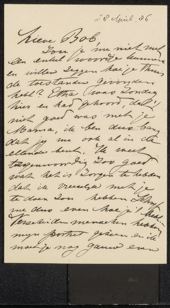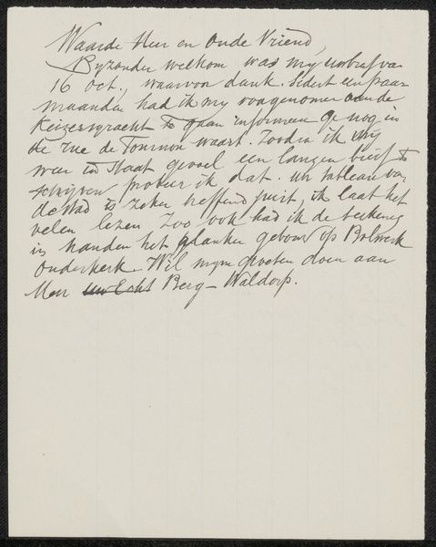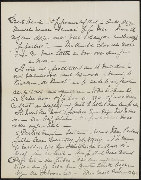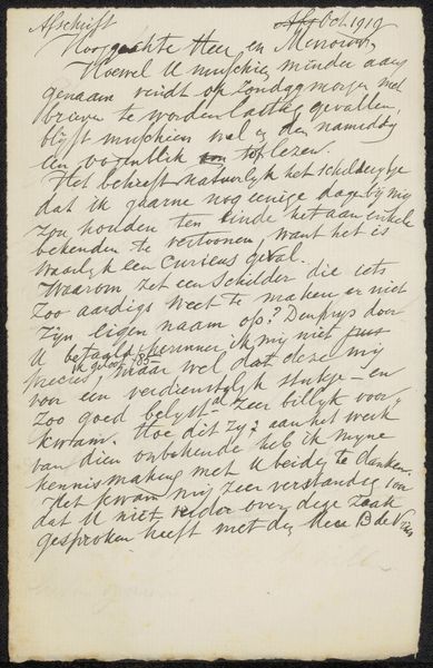 Curator: Well, well, what do we have here? It appears before us as a concept, adrift between intention and expression... this intriguing script by August Allebé, entitled "Conceptbrief aan anoniem," or "Concept Letter to Anonymous". Crafted somewhere between 1848 and 1927 with pen and ink on paper, a quiet, calligraphic piece housed at the Rijksmuseum. What are your first impressions? Editor: It's… intimate. I feel like I’m peering over someone's shoulder, reading a private thought. It feels unfinished and like a moment frozen in time. It's very simple – just the dark ink against the cream paper but creates such an intriguing and delicate mood. What do you read in this work, besides just a letter? Curator: Beyond its immediate intimacy, consider that we're holding a ghost of a conversation – one side rendered visible. What secrets are hinted at? The energy of Allebé is captured and made available to us today, in ways that, arguably, reveal so much more than simply the words recorded. Notice the frantic pacing of certain phrases next to deliberate calculated marks. Is this passion, or reflection? And what does that imply in our perception of art more broadly? What do you feel you have learnt after looking at this work? Editor: It's like catching a glimpse into the artist’s mind and to be given a different interpretation by someone else enriches the moment so much more! Curator: Indeed. It reminds us that art, like conversation, thrives in the space between the seen and unseen, the said and unsaid. It's so exciting to hear the views of other students that appreciate the visual experience too!