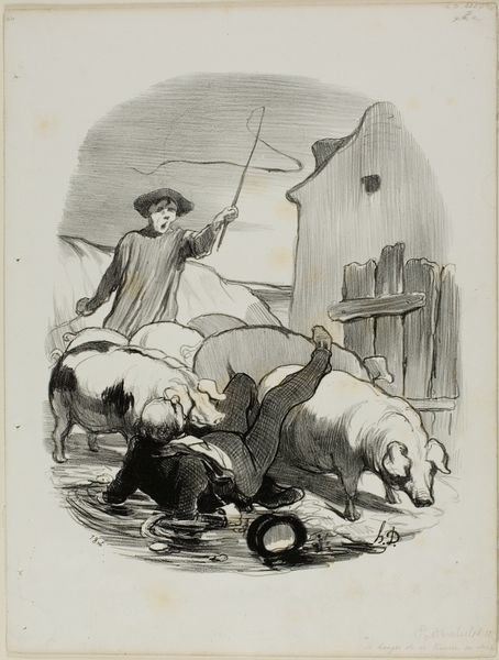 Here we see Honoré Daumier's lithograph, "C'est peut-être bon..." The composition is immediately striking: a stark contrast between the figure on the left and the desolate scene to the right. Note the man's solid form, defined by dense, cross-hatched lines, against the skeletal horses and barren landscape rendered with sparse strokes. This juxtaposition establishes a visual tension, highlighting the man's detachment from the scene. Daumier uses line not just to depict, but to critique. The man's gaze, averted from the horses, suggests a refusal to acknowledge a harsh reality. Semiotically, the emaciated horses act as a signifier of broader societal decay. The lithograph's power lies in its formal ability to provoke social commentary through the interplay of line, form, and perspective, prompting reflection on themes of class, consumption, and the human condition.