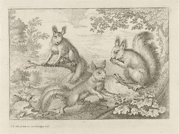 Curator: This is an etching by Francis Barlow, dating from the 17th century, currently held in the Tate collection. It depicts three squirrels in a landscape setting. Editor: It's intriguing. They're almost like caricatures, not just squirrels. There's a hint of theatricality, a narrative being played out. Curator: Barlow was renowned for his depictions of animals, and this piece showcases his skill in rendering them with personality. He secured many commissions from illustrating books, and this print likely served such purpose. Editor: Absolutely. This image speaks volumes about the social attitudes towards the natural world. Are these squirrels observed or are they allegorical figures representing aspects of human behavior? The expressions alone make me question the relationship. Curator: Perhaps Barlow is reflecting a growing interest in natural history, but filtered through human understanding and storytelling. Editor: A fascinating commentary! It makes one reconsider our ingrained assumptions of nature as 'separate' from human society. Curator: Indeed, art often reveals more about us than the subjects themselves. Editor: Precisely, these squirrels offer a mirror to humanity!
