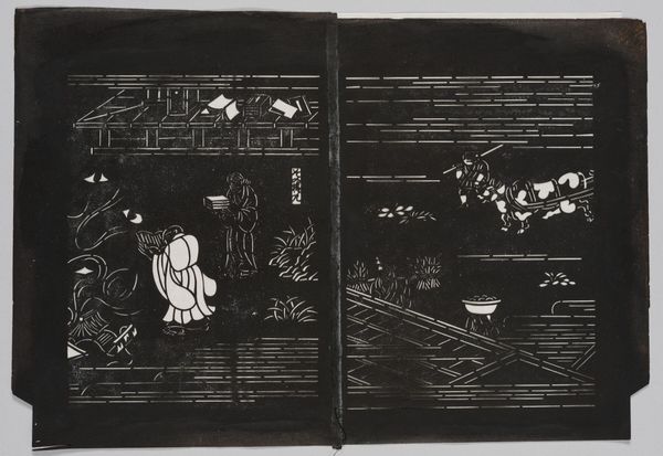 Curator: This stencil by Serizawa Keisuke for the Illustrated Don Quixote is a stark, beautiful dance between black and white. It almost feels like a dream I once had, or perhaps a story whispered in the dark. Editor: It does have that quality! With the architectural elements and the figures in action, it seems to suggest a narrative, almost like panels in a graphic novel. What story do you see unfolding? Curator: Ah, the story! It's like peeking through a keyhole into someone else's imagination. I see the artist playing with the contrast of Japanese visual language and the themes of a Spanish novel, a kind of playful cultural collision. Can you feel the energy of Don Quixote’s adventures, even filtered through this unique lens? Editor: I think I can. It’s amazing how the same story can morph across cultures. Thank you! Curator: My pleasure. It's a reminder that art, like stories, can travel and transform, picking up new scents and colors along the way.