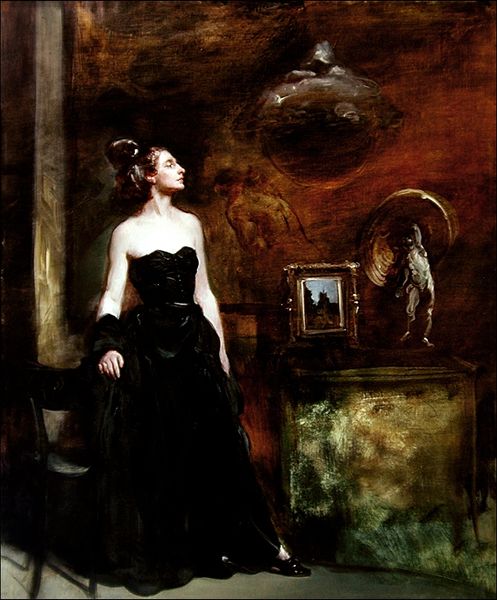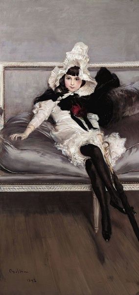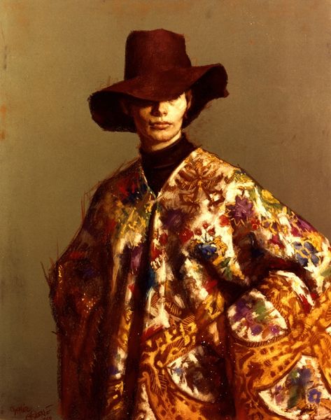 Curator: Here we have Joseph Dadoune's photographic work, "Sion," created in 2006. Editor: There’s a potent theatricality here, a tableau vivant almost. The way the figure’s gown mimics the movement in the paintings behind her creates a mesmerizing interplay of stasis and dynamism. Curator: Dadoune’s work frequently explores themes of identity and representation, often engaging with historical narratives. Notice how the sitter, poised between two monumental paintings, becomes another subject framed by history itself. I wonder what historical narratives she is inhabiting? Editor: The formal echoes are undeniable. Consider the color palette - the juxtaposition of emerald and dark green. This is repeated in the artwork behind her. Also, that play of light—the illumination on the dress’s satin juxtaposed with the darker fabrics, it mirrors the chiaroscuro effects in the paintings in the background. It is perfectly constructed. Curator: Precisely, and it begs the question: who gets to be centered in historical narratives, and who remains on the periphery? This image is rich with gender and power dynamics, not only within its frame, but more broadly. This photograph situates the subject within the tradition of grand portraiture while questioning its inherent biases. Editor: Undoubtedly. The composition further underscores that tension. The figure is both foregrounded and subtly engulfed by the paintings; the paintings vie for attention—creating a visual tension that forces us to navigate these different levels of signification. Curator: To your point, this photo provides not only an artistic and political perspective, but it captures this subject’s emotional space and perhaps an attempt to reckon with history's tendency to either glorify or erase, and this very visibility can itself be a powerful act of resistance and remembrance. Editor: Seeing Dadoune’s work this way, emphasizing not just formal elements but also broader considerations of history and representation, I see those connections strengthened in my own view of "Sion."