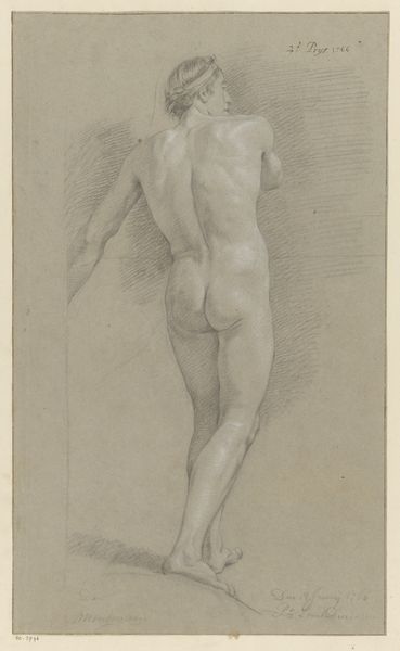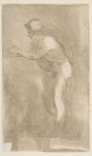 Curator: Before us, we have "Standing Apollo, left arm raised" a pencil drawing executed by Willem van Mieris sometime between 1672 and 1747. Editor: It has the stillness of a sigh. Or a held breath. Almost as if Apollo is pausing mid-stretch. I feel the moment before action. Curator: The academic approach is evident, focusing on precise anatomical detail. The pose invites scrutiny, doesn't it? The raised arm, the contrapposto stance—classic elements deliberately deployed to explore ideal human form. Note the delicacy of line, the subtle shading suggesting volume and texture. Editor: Absolutely, and you know, that's what makes it captivating, this blend of precision with this airy quality. The pencil strokes feel almost tentative in places, unfinished, especially lower left of the composition which, weirdly, amplifies his presence. It’s not just an ideal form; it feels...alive with potential, a becoming, as if in the process of drawing himself into existance.. Curator: Precisely. And consider the function. A preparatory study perhaps. Notice the way the drapery is rendered only in suggestive strokes, serving to highlight rather than conceal the figure's musculature. Editor: Or maybe Mieris was having a little philosophical giggle here. Apollo, right? God of light, music, poetry—and Mieris captures him... just stretching, mortal-like. Almost ordinary, except he's still glowing, you know? And it makes you wonder: even gods gotta stretch now and then, don’t they? The most mundane pose elevating the artistic value.. Curator: A whimsical interpretation indeed, though I maintain the core intent remains the exploration of idealised form within a classical framework. Its semiotic function transcends mere representation to embody notions of beauty and aesthetic excellence as then prescribed by academic thought. Editor: Maybe that is so. But what matters to me is the enduring image of Apollo, ready for whatever the day might bring. Now that is what I will bring away from this discussion today! Curator: A refreshing perspective, bringing this exploration to a more introspective experience which can definitely amplify the perception of the overall aesthetic.