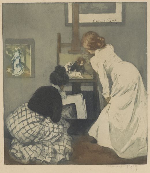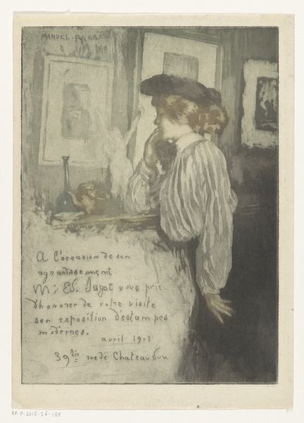 Manuel Robbe made 'Vrouw voor een prentstandaard' with subtle aquatints. It’s all about soft edges and understated hues, which speaks to a sensibility that embraces the process as much as the final image. The way he's layered the aquatint gives everything a blurry, dreamlike quality. Look at the woman's lace collar – it's not sharp or defined, but kind of fades into her skin. The subtle washes of color, from her pale blue blouse to the dark folds of her skirt, create a mood that’s both intimate and detached. Then there's the woman herself, lost in her world of prints. It's like Robbe is inviting us to see art as a personal, immersive experience, full of ambiguities and open to interpretation. The artist Whistler springs to mind with the muted colour palette and subject matter. I think this piece highlights how art is less about fixed meanings and more about endless possibilities.