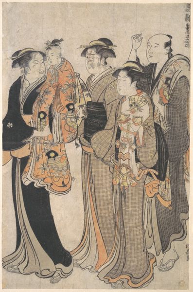 Curator: Welcome. Today we’re looking at "Kamioki, from the series "A Brocade of Eastern Manners (Fuzoku Azuma no nishiki)"" a woodblock print crafted around 1783-1784 by Torii Kiyonaga. Editor: The elegant stillness is striking. These figures are flattened, yes, but they fill the space with subtle variations of texture and pattern. The clothes define the characters, it's not exactly a portrait but I still get a sense of the people wearing them. Curator: It certainly gives us a window into the fashions and customs of the Edo period. Kiyonaga, as a leading ukiyo-e artist, was capturing contemporary life for the merchant class, these people are likely upper-class merchants enjoying leisure time. We can gather social clues, like family status and the celebration of Kamioki from details of attire. Editor: I am drawn to the patterns in their robes and sashes. You can see the fine lines in the prints and admire how that repetition is crucial to establishing depth and form, while ultimately creating such distinct silhouettes through considered arrangement of lines and colors. Curator: Absolutely. Woodblock printing demanded meticulous work, from the initial design to the carving of the blocks and careful layering of colours. And while the ukiyo-e genre often depicted courtesans and actors, Kiyonaga emphasized more everyday scenes, bringing his figures out of interior settings and portraying them amid natural settings, engaging with customs of the period. Editor: I wonder about the workshop dynamics involved. Were these artists working directly with the artisans and craftsmen to achieve these subtleties in tone and color or where they providing technical specifications from a distance? I am fascinated by the interplay between artistry and skilled labor, which tends to disappear when we just talk about the name of the artist. Curator: An important point, the commercial success of prints like these involved teams of block carvers and printers. Kiyonaga oversaw the process, yes, but we must not forget those crucial skilled artisans who helped him realize his creative vision. It points to an exciting intersection between high and low art, where craftsmanship and creativity meet commercial demand. Editor: Well, I have gained a renewed appreciation for how much work, materials and process go into an apparently "simple" print, especially because of the emphasis that Kiyonaga placed on materials that evoke details about the world of its time. Curator: And I hope this has provided some insights into how woodblock prints helped shape and reflect the social values and aspirations of the Edo period, illustrating how a medium gained prominence for its accessability and widespread availability, helping disseminate a style of aesthetics that prevails today.