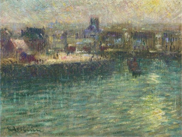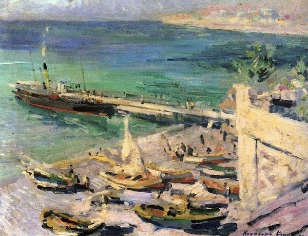Boris Kustodiev painted this view of Nice using oil on canvas. The nature of oil paint is such that the artist can easily blend the colors and produce an image of soft edges and blurred forms. The image is a riot of brushstrokes, applied in a loose, impressionistic manner. Note the artist’s active engagement with the materiality of the medium: the way the paint is applied, thickly in some areas and thinly in others, creates a surface that is rich in texture. The light shimmers and dances across the buildings and water, imbuing the scene with a sense of movement and life. The artist has skillfully manipulated the medium of oil paint to create a fleeting impression of a place, capturing the essence of a moment in time. This demonstrates the skill and artistry involved in the traditional techniques of painting, emphasizing the significance of the material qualities and the artist's process in understanding and appreciating the artwork.