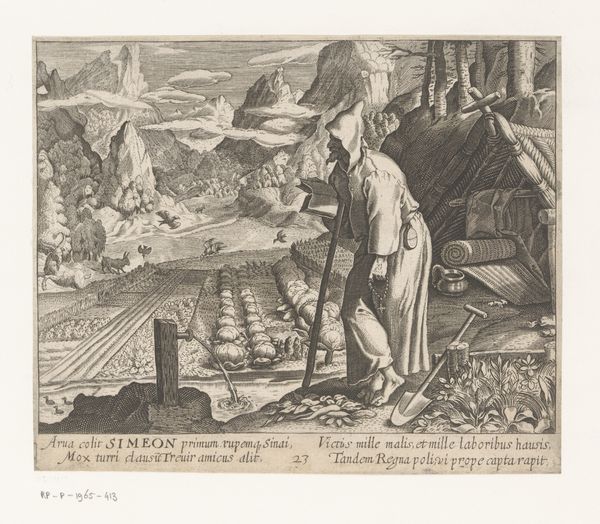 Johann Sadeler I created this print, Set en Enos, sometime in the late 16th century. The detailed engraving presents a bustling landscape filled with figures and intricate details, all rendered in a monochrome palette. The eye is drawn to the contrasting textures, from the dense foliage to the smooth skin of the human figures, creating a rich visual experience. The composition is carefully structured, with a balance between the detailed foreground and the receding background. Lines define forms, and the use of light and shadow adds depth and volume, highlighting the artist's mastery of the medium. This print operates as a semiotic system, where each element—the ladder, the trees, the figures—serves as a signifier within a larger cultural and philosophical discourse. Consider how the artist uses these formal elements to create meaning. The structured composition, the detailed textures, and the careful balance of light and shadow all contribute to the overall narrative. This isn't just about aesthetics; it reflects broader artistic and philosophical concerns of the time, challenging fixed meanings and inviting ongoing interpretation.
