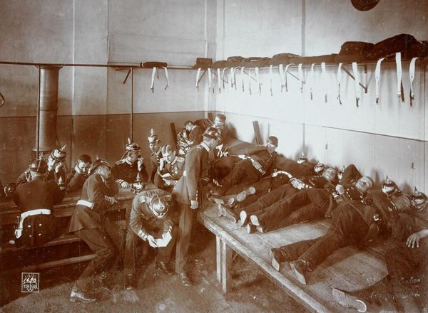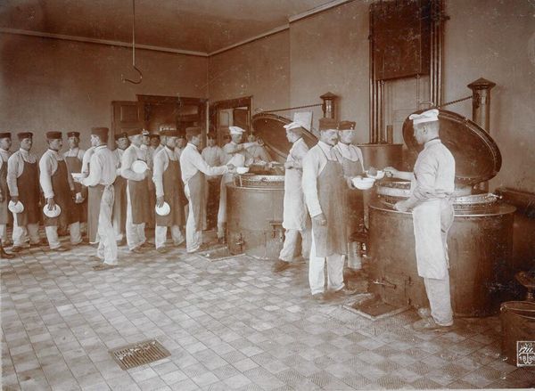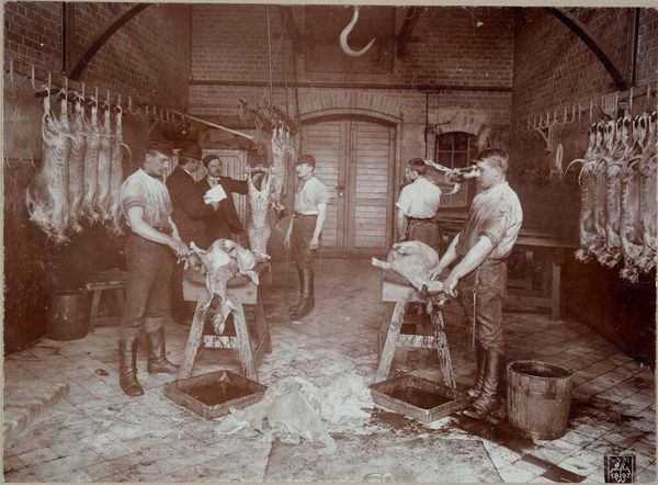 Curator: This is Waldemar Titzenthaler’s photograph, "Health, General: Germany. Berlin. Municipal Slaughter House," captured at an unknown date. It’s quite graphic, isn’t it? Editor: Yes, strikingly so. The sepia tones and composition render this industrial process—the slaughter of animals—almost clinical, yet undeniably visceral. What's your take on its social commentary? Curator: The scale of the operation is what strikes me, as well as the division of labor. Consider the material aspects, the sharp tools, the tiled floors, and the animal carcasses hanging from the ceiling. Each element speaks to the industrialization of food production. Editor: Absolutely. This image challenges our notions of sanitized food consumption. It forces us to confront the realities of meat production and the social structure that supports it. It reminds me of Upton Sinclair’s “The Jungle,” which exposed the plight of laborers and the unsafe conditions in meatpacking plants. Curator: I see it as an early exploration of industrial processes, one which brings into sharp focus how labor is organized and how material transformation is carried out. Editor: For me, this photograph serves as a potent reminder of the historical context and ethical implications of our food systems. Curator: A powerful convergence of material reality and socio-political awareness then, it would seem.