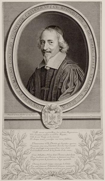 Editor: This is a portrait of Claude Regnauldin by Robert Nanteuil, from the Harvard Art Museums. It looks like an etching or engraving, right? It gives off a very formal, almost austere vibe. What do you see in this piece? Curator: Ah, Nanteuil! His portraits have such a wonderful precision. For me, this isn’t just a likeness, but a capture of Regnauldin's essence, almost a psychological study. Notice the lines around his eyes, the slight smirk – do you think it hints at his personality? Editor: Maybe a little bit? I hadn't really noticed the smirk before. Curator: Exactly! It's those subtle details that transform it from a mere record into a work of art. It makes you wonder about his life, his thoughts. It certainly makes me wonder. Editor: I see what you mean. I was just reading it at face value! Curator: I bet. Always go deeper when you have the chance.