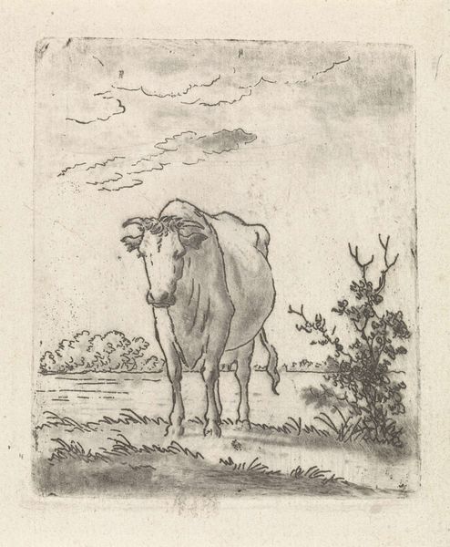 Pieter Janson made this small etching of a calf in the late eighteenth or early nineteenth century. At this time, prints were becoming increasingly available to a wider public, and their subjects often reflected the interests of this new audience. The etching presents the calf in a detailed manner, typical of the Dutch tradition of landscape and animal painting. However, this calf isn't just any animal; it's a symbol of agricultural prosperity and rural life, values that were becoming increasingly important as the Netherlands underwent significant social and economic changes. The rise of a merchant class and growing urban centers created a sentimental attachment to the countryside. Pictures like these offered a nostalgic look at a simpler, idealized past. To fully appreciate this image, we need to understand the period's social and economic transformations. Archival records, agricultural reports, and period literature can tell us more about the cultural values attached to rural life during Janson's time.