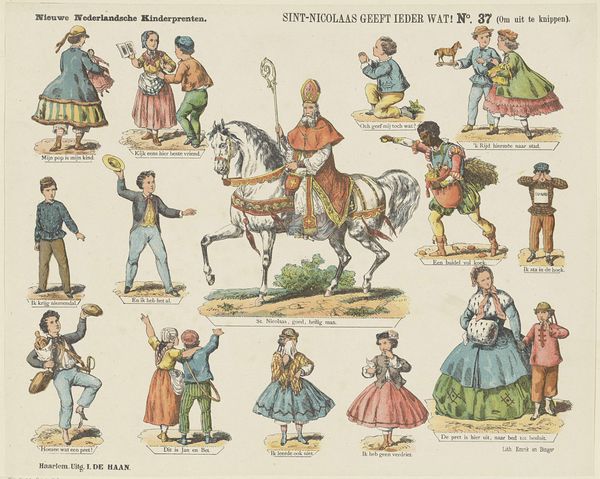 Here we see a lithograph titled 'Uit het leven van Arlequin', or 'From the Life of Harlequin' by Jan de Haan. It is an episode from the 'New Dutch Children's Prints'. De Haan presents a series of vignettes depicting Harlequin, a character from the Commedia dell'arte tradition. Harlequin's journey, as depicted here, reflects societal expectations placed upon individuals, especially concerning class and labor. Traditionally Harlequin is a servant, and his colorful costume marks him as other, outside of normal society. The print captures how these figures negotiate societal hierarchies. Consider the scene where Harlequin serves Pantalone, highlighting the power dynamics at play. The narrative unfolds with themes of love, labor, and social mobility, yet, it also captures moments of tenderness and joy, as we see Harlequin surrounded by children. By exploring the life of this iconic figure, de Haan invites us to reflect on our own roles within society, and the universal search for identity and belonging.