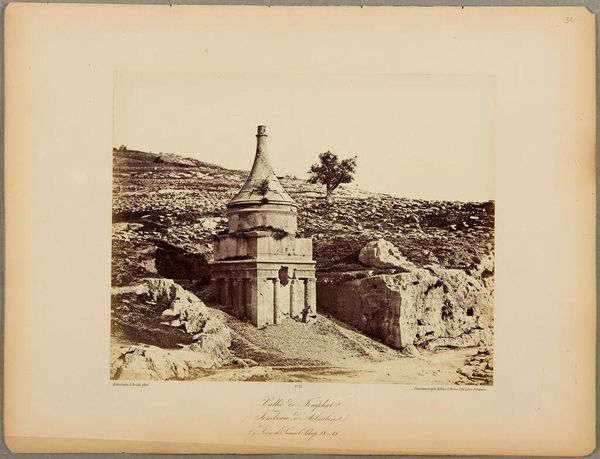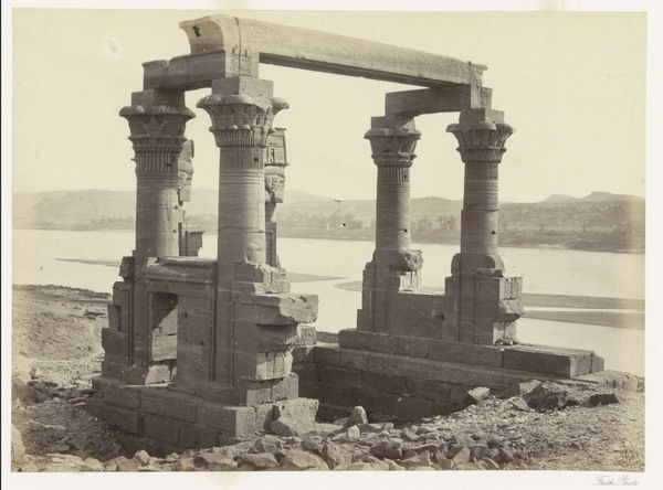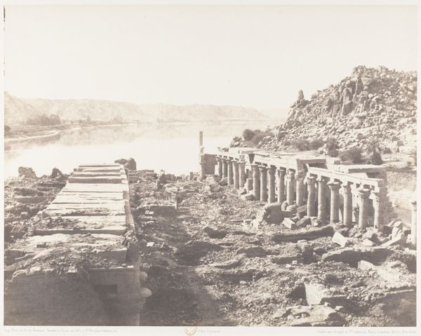 Curator: Francis Frith created this albumen print, titled "View from Philae, Looking North," in 1857. The work offers a compelling view of ancient ruins alongside the natural landscape. What's your immediate reaction? Editor: Bleak grandeur. The albumen process gives it a sepia tone that feels ancient, almost ghostly. The composition, though, is really dynamic. The crumbling architecture leads the eye into the receding landscape. There’s a tension between the human-made structures and the rugged natural formations that's captivating. Curator: Indeed. The architecture shown would be structures erected to honor Isis. Philae was a crucial cult center, thought to be one of the burying locations of Osiris, deeply tied to renewal and rebirth symbolism within Egyptian religious traditions. Editor: The ruined state certainly speaks to that. Note how the artist used shadow. Look at how the strong horizontal lines and verticality of the pillars create depth, guiding your eye. I also think it establishes a somber mood in a very literal way, which enhances the overall emotional effect. Curator: I see the ruin in connection to the decline of pharaonic authority. Its visual emphasis echoes the fading power of the goddess, but there's more to it. The lotus and papyrus capitals are a clear visual marker for unification, representing Upper and Lower Egypt coming together. That Frith captured this as photography became increasingly accessible to England adds another layer of complex visual storytelling, no? Editor: Definitely. The albumen printing gives the ruins an almost ethereal quality, while also holding tight to photorealistic qualities that underscore the weight of history on this island in the Nile. Curator: Ultimately, this photograph encapsulates cultural continuity amid destruction, revealing lasting symbols from an era that continues to shape our perceptions. Editor: It's a poignant visual statement on time and transformation, isn't it?