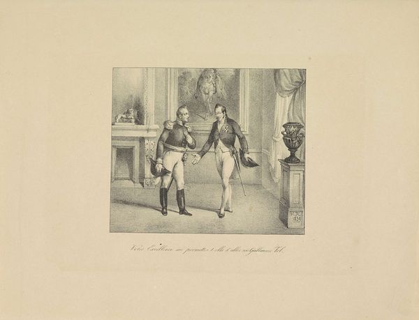 Editor: Here we have “Koning Willem I bestraft een vleier,” or “King William I Punishing a Flatterer,” a print from 1829. The engraving style really lends itself to the starkness of the scene, almost like a political cartoon. It makes me wonder about the historical context. What’s your take on this piece? Curator: Ah, a print brimming with the delicious tang of power dynamics! You see the crisp lines of Neoclassicism clashing a little with the blossoming Realism—like a general reluctantly trading his wig for a more practical haircut. Consider William I, not just as a king, but as a father figure to a very young, rather unruly Belgium. Editor: Unruly how? Curator: Well, Belgium was, at that time, part of the United Kingdom of the Netherlands, and simmering with revolutionary ideals. Now look at our flatterer grovelling—is he genuinely remorseful, or merely playing the game, hoping to sneak a rebellious idea past the King's defenses? Perhaps William is teaching him that leadership demands honesty above flattery. Do you get that feeling from the way he looks away? Editor: That makes so much sense! It adds layers to the print. Initially I only perceived what seemed to be an angry ruler, not a calculated politician managing unrest. Curator: Precisely! Art often invites us to be detectives. Prints like these are historical breadcrumbs; some may say this scene is of small consequence, but perhaps that is its allure. Editor: This print really taught me to look past the obvious narratives presented by an artwork and look into some historical elements. Thank you.