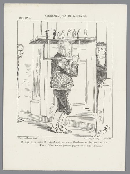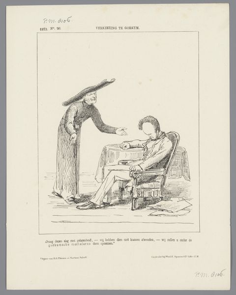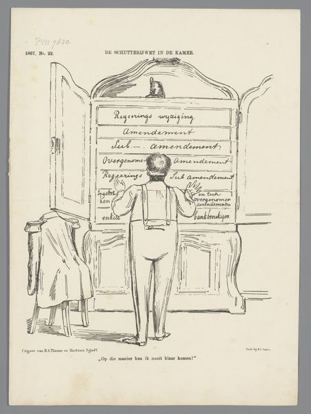 This political cartoon was created in 1877 by Johan Michaël Schmidt Crans, using ink and paper. The work, titled "Spotprent" or "Cartoon", engages with the complex social and political tensions of the late 19th century. The cartoon depicts a man kneeling on a chair, pointing to a papal emblem hanging above him. This imagery likely critiques the power and influence of the Catholic Church in Dutch society at the time. Crans's work reflects the ongoing negotiation between religious authority and secular governance, a tension that has shaped Dutch identity for centuries. By portraying a figure in a posture of supplication before religious symbols, the cartoon perhaps comments on the perceived subservience of political figures to religious institutions. It invites us to consider the historical weight of religious institutions and their role in shaping political and personal identities.