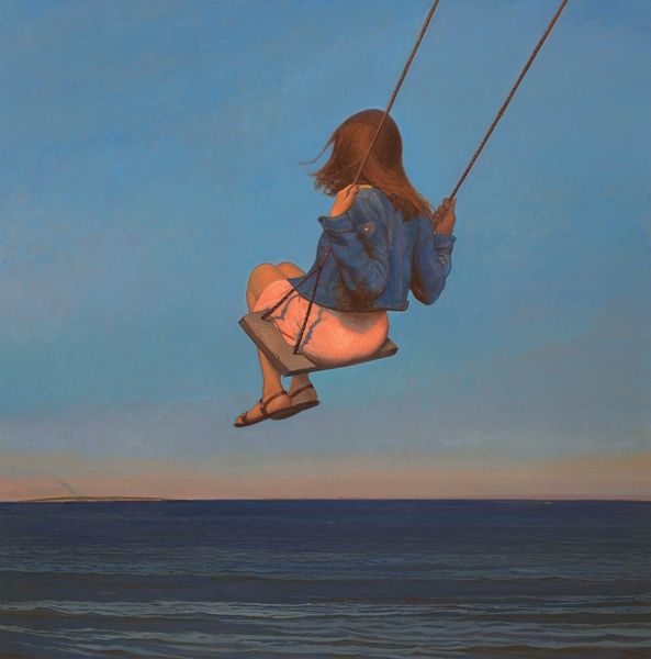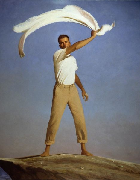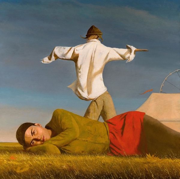 Editor: We're looking at Bo Bartlett's 2019 painting, "Draw Out the Child," an acrylic plein-air portrait. There’s something very arresting about the stark, almost surreal scene. What can you tell me about it? Curator: Let’s think about what acrylic plein-air implies. Bartlett chooses a distinctly modern, manufactured medium to capture what appears to be an unscripted, outdoor moment. How does this clash or collaborate? The choice reflects a tension inherent in contemporary art, and perhaps social existence too. Acrylic is itself a mass-produced commodity – linking high art and a more accessible making. Editor: So, you're focusing on the materials used? I guess I was drawn more to the subjects – a man holding what appears to be either a child or a small adult. Curator: Exactly. How does Bartlett utilize those relationships in materials and labor? Consider, this "plein-air" execution still requires immense labor, doesn't it? Is the accessibility a democratization of art making or simply another market force? Are viewers implicated through its scale? How are the class issues handled in Bartlett’s painting here? The clothing materials are also highly generic… why? Editor: I hadn't considered how the everyday quality of acrylic paint challenges elitist concepts of traditional artistry, especially with something as timeless-seeming as a landscape portrait. Does his choice imply some sort of societal critique? Curator: Perhaps a gentle one. The "child" element of the title suggests vulnerability and intimacy, but within this context, we might explore themes of dependence, power dynamics, or even environmental concerns. Can we see the individual relationships only by discussing its relationship to the system, including manufacturing? Editor: It makes me reconsider how much the simple materials contribute to a larger, more complex discussion about society and how we all fit into it. Curator: Indeed. By acknowledging the means of production and cultural context, our reading of the piece can become incredibly deeper, beyond mere aesthetics.