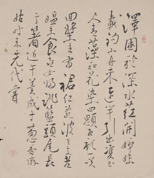 This hanging scroll was made by Yanagawa Kōran, likely in the mid-19th century, using ink on paper. The material's influence is evident in the artwork's delicate texture and the way the ink bleeds slightly into the absorbent paper, creating subtle variations in tone and depth. Calligraphy is more than just writing; it's a skilled practice requiring years of training to master brush control, ink consistency, and the precise execution of each character. The creation of the artwork involves a combination of mental and physical discipline, transforming raw materials into an object of artistic expression. The importance of materials, making, and context helps us to fully appreciate the meaning of this artwork, and challenges the rigid distinctions between fine art and craft. The labor, skill, and artistic expression involved in its creation offer a glimpse into the cultural values and social dynamics of its time.