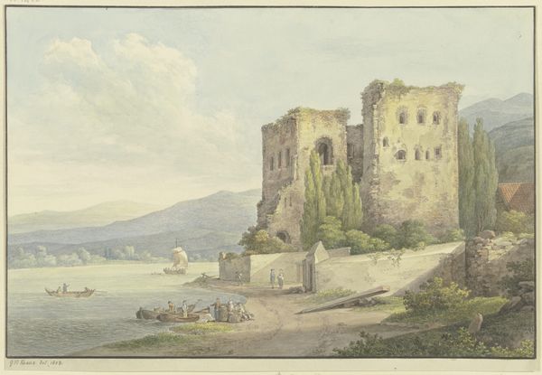 Curator: Georg Melchior Kraus captured this image of Heidelberg Castle between 1790 and 1794, and it is currently housed here at the Städel Museum. The artwork employs colored pencil, ink and watercolor on paper, very nicely showcasing architecture in a plein-air style. Editor: My initial response is one of serene decay. The composition really draws my eye to the crumbling stone and lush overgrowth. I appreciate how the architecture presents vertical, reaching forms, contrasting with the verdant horizontal surge. Curator: I'm glad you picked up on the 'decay' aspect. Romanticism loved to focus on ruins and their symbolism - time, the collapse of systems. You'll notice Kraus chose materials suited to plein-air work allowing for quick study, almost a recording, of this particular view. Paper was fairly cheap, ink and pencil easily transportable. Editor: The tension between control and looseness fascinates me, reflecting a similar pull I see between civilization and nature. Take how those defined architectural forms meet the natural curves of foliage in the lower register, as they visually creep up the facade of the castle walls, illustrating what can only be described as natural progression. It speaks to temporality in that way. Curator: And Kraus was deeply embedded in the social and political currents of his time. He wasn’t just painting a pretty picture of a ruin. The production context matters. Heidelberg Castle had been ravaged during the Palatine War of Succession over a century before, and it became a potent symbol of German national identity. He likely sold multiple reproductions. Editor: Precisely! And note how Kraus frames the composition: not through overtly dramatic skies or harsh lighting, but through a more subdued, almost documentary lens, allowing the architecture, composition, and the textures created by his distinct employment of his selected media, to narrate. Curator: This work illustrates an interesting connection between craft and fine art. The means of production had to align with popular demand, artistic vision, and economic factors to truly resonate during this particular moment in history. I am struck by his skill. Editor: Absolutely. For me, the enduring power lies in that skillful and visually poignant convergence of form and material—the way the physical artwork embodies both the weight of history and the ethereal touch of light and color.