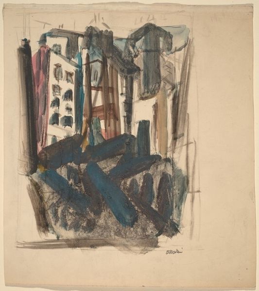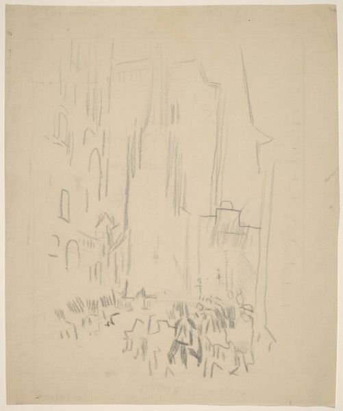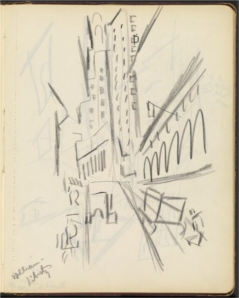 Editor: We're looking at John Marin’s "Brooklyn Bridge and City Scene N.Y.C.," a pencil drawing from 1924. It’s quite abstract; the bridge and buildings are suggested with dynamic, almost chaotic lines. What are your initial thoughts on the composition? Curator: The immediacy of the line is striking. Observe how Marin uses varied directional strokes to create a sense of depth and movement. Note also the limited tonal range—essentially a monochrome study in texture achieved purely through mark-making. Editor: So, it’s less about representation and more about… the feeling of the city? Curator: Precisely. Consider how the dynamism and fragmentation prefigure later movements. Do the converging lines suggest a collapse or explosion of form, or perhaps the energy inherent within urban architectural constructs? The subject almost dissolves into pure abstract line. Editor: It feels very… unfinished. Almost like a sketch capturing a fleeting moment. Curator: I would counter that its ‘unfinished’ quality highlights the pure essence of form. Note how the composition avoids clear focal points; our eyes are directed throughout the piece, guided by an intricate network of line. The surface exists more as a pure expression than any perspectival record. Does that not present a fascinating tension in its incompleteness? Editor: It does! I originally saw it as chaotic, but focusing on those lines and the varying textures changes the entire effect of the piece. Curator: Indeed. We often impose preconceived notions of finish and representation, overlooking how an artist can convey significant meaning through the simplification and exploration of basic visual elements.