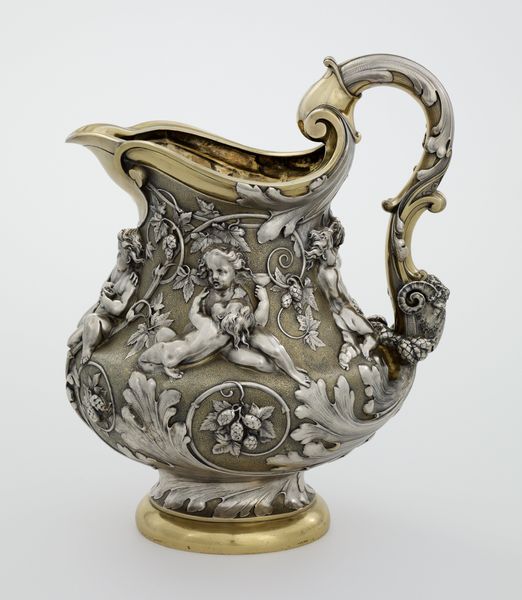 Curator: The piece before us is "The Holyoke Caudle Cup", crafted by John Coney, a prominent silversmith, around the turn of the 18th century. It's a fascinating example of early American silver. Editor: It has a striking formality, yet the cherubic figures and floral motifs evoke a sense of playful abundance. It’s as if they try to escape the cup’s intended use. Curator: Indeed. Caudle cups were used to serve a warm, spiced drink, often given to women after childbirth. The decoration, with its family crest and representations of fertility, served a social and symbolic purpose. Editor: That’s interesting considering the time period. How does its craftsmanship speak to the socio-political context of early colonial America? The handles look almost like they are straining under the weight of tradition. Curator: Coney's work reflects the aspirations of the rising merchant class, eager to emulate European traditions while establishing their own identity. Silver objects, like this cup, were potent symbols of wealth and status. Editor: It’s quite a tangible expression of the intertwined roles of gender, class, and ritual. I wonder how the women who received this felt, being given a luxury object after the throes of childbirth. Curator: Ultimately, this caudle cup provides insight into the social dynamics of early America, revealing how art objects were not merely decorative, but actively shaped cultural identities. Editor: Agreed. Analyzing this cup truly enriches our understanding of those hidden intersectional stories.