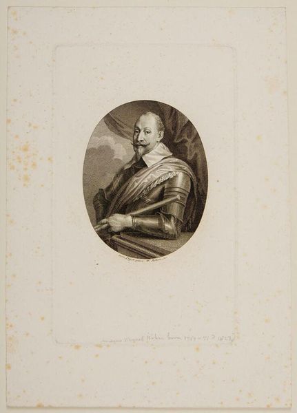 Editor: Here we have N. Dupin's print of Maximilian de Béthune, duc de Sully, minister to Henry IV. The man’s gaze is so intense. I’m curious, what stands out to you when you look at this portrait? Curator: The precision! Imagine the artist, Dupin, carefully etching each line to capture Sully's gravitas. It makes me wonder about their relationship. Was this commissioned? A labor of admiration? What do you think? Editor: That's fascinating to think about. I hadn't considered the artist’s perspective. Curator: Exactly! And look at how the circular frame isolates him, almost like a coin. It's all about power, isn't it? Editor: Definitely gives you a lot to think about. Thanks for this.