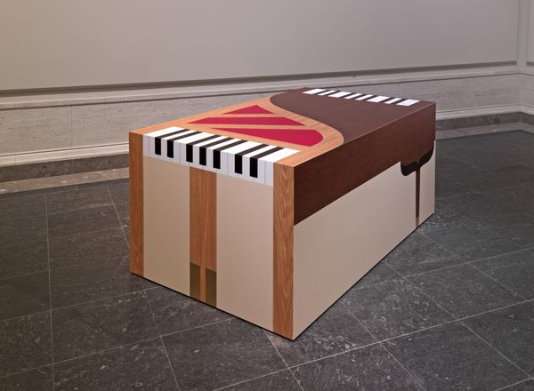 Editor: We're looking at Jan Vercruysse's "M(M10)" from the Tate collection, and I’m struck by the almost sterile, unreal quality of the piano. It feels like a symbol, but of what? What do you see in this piece? Curator: The piano, divorced from its function, becomes a potent symbol of cultural memory. It’s elevated, almost crucified, on these painted blocks. Do those colors remind you of anything? Perhaps children's building blocks? Editor: I do see that. So you're saying it’s a commentary on the relationship between childhood and high culture? Curator: It's a question of the piano's cultural weight, and how that weight is supported, or undermined, by these seemingly simple forms and their connotations. It prompts us to question our own cultural inheritance. Editor: I hadn't considered that interplay. It’s fascinating how a familiar object can be transformed into something so thought-provoking. Curator: Indeed. The power of symbols lies in their ability to evoke complex emotions and associations.