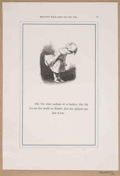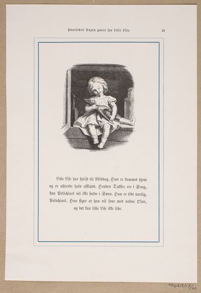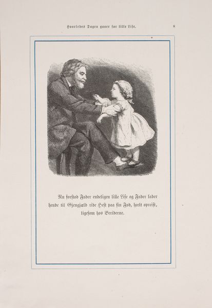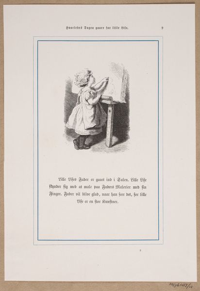 Lorenz Frølich created this illustration for "Hvorledes Dagen gaaer for Lille Lise" using primarily line work to define shape and form. The composition centers on two figures, a mother and child, positioned around a piano-like structure that anchors the scene. Frølich employs hatching and cross-hatching to create tonal variations, which model the figures and their clothing. Notice how these techniques give volume to the mother’s dress and the child’s features. This use of line is not just descriptive but also expressive, guiding the viewer's eye and establishing a hierarchy within the composition. The contrast between the detailed foreground and the simpler background enhances the focal point, emphasizing the relationship between the two figures. The linearity of the image invites a reading that parallels the narrative it accompanies. The drawing’s structure supports a semiotic interpretation, where each element—the characters, the setting, the texture—contributes to a larger story about domesticity and childhood. It’s a beautiful example of how form serves to articulate cultural values and narratives.