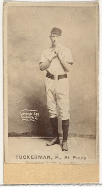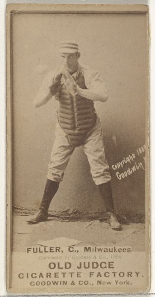 Curator: This is a baseball card from 1889, part of the Old Judge series produced by Goodwin & Company. It features John E. "Scrappy" Carroll, a right fielder for the St. Paul Apostles. Editor: The sepia tone and the way he holds the bat almost ritualistically gives it the feel of an old photograph from a family album – one tinged with pride and the golden age. Curator: Exactly. These cards weren't just images; they were manufactured collectables inserted into cigarette packs as a marketing tactic. Consider the means of production—photography combined with printing technology, all to sell more cigarettes. And "Scrappy" Carroll himself becomes a commodity in this exchange. Editor: And yet, even mass-produced, the image holds a heroic aura. Look at the belt cinching his waist, dividing his body like an ancient warrior's armor. Baseball uniforms signified belonging and aspirations during a burgeoning era of organised sport. It’s a carefully constructed iconography of the athlete as a figure to be emulated. Curator: And look closely, notice the wear, the tiny creases. These weren't kept in pristine display cases; they were traded, collected, handled, subjected to wear and tear by working class men and boys—part of everyday culture and commodity circulation. The materials speak volumes about how the image circulated. Editor: I am drawn to the fact he is holding the bat across his body; it gives a feeling of pause and thoughtfulness, which contrasts sharply with the rough and tumble nature associated with baseball. There is something almost passive and waiting there – maybe hope too. It almost invites the viewer into the stadium. Curator: Right, its impact lies in its everyday function within the rise of consumer culture. It's a tiny, paper-based object imbued with social significance— reflecting baseball, commodification, and a specific moment in American history. Editor: I’ll be thinking about how, as an image, it straddles the line between commercial product and evocative portrait for some time. Curator: Agreed; it gives new dimension to thinking about these cards in terms of their original circulation and use.