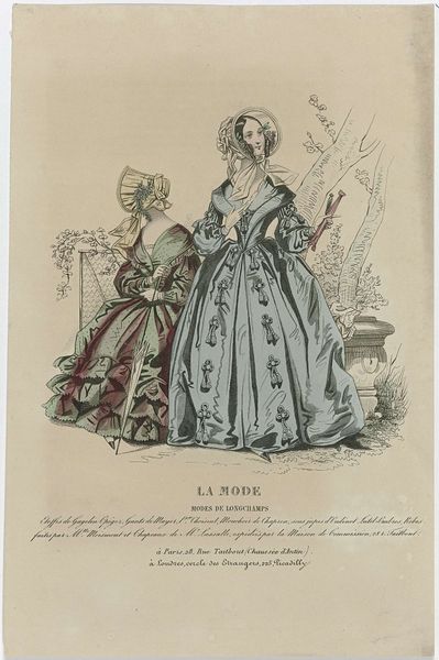 Curator: Looking at this mixed-media print titled "Petit Courrier des Dames, 25 septembre 1840, No. 1673," dated 1840 by an anonymous artist, I’m immediately struck by the stark contrast in textures and the somewhat rigid composition. Editor: Oh, it’s got a lovely delicate melancholy about it. All those soft watercolors and flowing lines...almost a whisper from another time. Makes me think of pressed flowers and handwritten letters sealed with wax. Curator: Note how the artist uses line to define the forms of the women’s dresses. The ruffles at the bottom of the green gown create a repetitive pattern, a sort of visual rhythm which contrasts with the chaotic paisley of the shawl. The bonnet seems a device that encloses the figure’s face. Editor: Yes, those shawls do seem chaotic now that you mention it, as if each woman is wearing a very busy garden. I do get this odd feeling of restraint. Almost like these fashionable women are caged, in a way, by their attire and social expectations. It seems so removed. Curator: It reflects Romanticism through its focus on emotional expression but through an emphasis on sartorial detail, highlighting the rising industrialization. Editor: Hmm, rising industrialization meets emotional expression… it's the juxtaposition that gets me. Something deeply personal, but all presented with cool reserve and rigid attention to the patterns in the shawls, dresses and bonnets. Curator: It is tempting to interpret that disconnect with Romantic ideals that also suggest societal control via this exactness and emphasis on these particular signifiers of dress and style, all framed with a careful sense of presentation and precision. Editor: Thinking about it, maybe the artist saw this too—a world becoming ever so beautiful, and yet confined? The art and artifice almost eclipsing real emotional connection? Curator: Indeed, these fashion plates were both a form of information but also cultural objects themselves, telling us as much about anxieties and class concerns as trends. Editor: The patterns and forms start to dissolve, or perhaps resolve into something a bit deeper, revealing hidden things—ghosts within this snapshot of fashionable propriety and poise. Thank you for pointing that out to me.