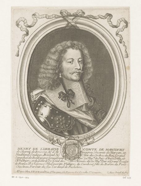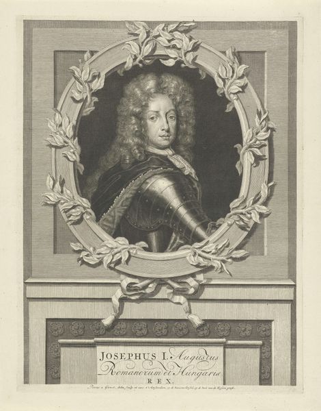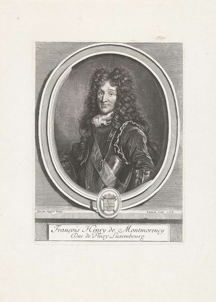 Gérard Edelinck’s portrait of Jacobus Frans Eduard Stuart is an engraving whose composition immediately draws us into a world of calculated representation. The oval frame, precisely rendered with meticulous detail, contains the youthful prince, whose gaze directs us just off-center, engaging but not confronting. Notice the symmetry Edelinck establishes, not with a mirror image, but through a series of balanced elements. The curls of Jacobus’s hair cascade in deliberate disarray, each strand a carefully placed line that softens the rigid structure of the portrait. Below, cartouches flank the inscription, their rounded forms echoing the oval above, securing the composition within its rectangular boundary. This isn't merely a record of appearance; it is a construction of power through form. The controlled lines of the engraving, the balanced composition, and the calculated gaze all serve to reinforce the subject's status. It is a formal declaration, not just of identity, but of authority. Consider how this structured presentation might reflect, or even challenge, the shifting political landscape of the time.