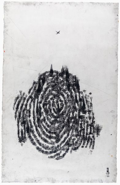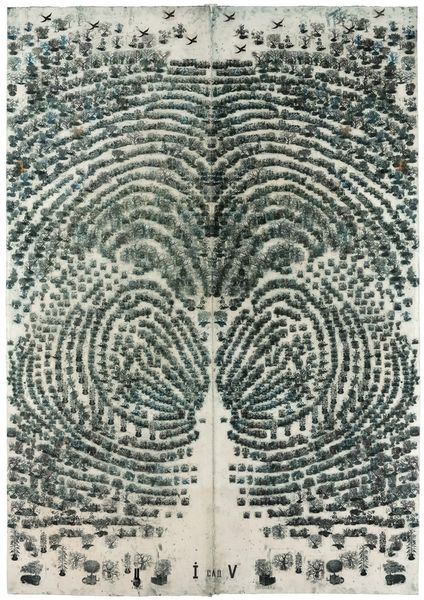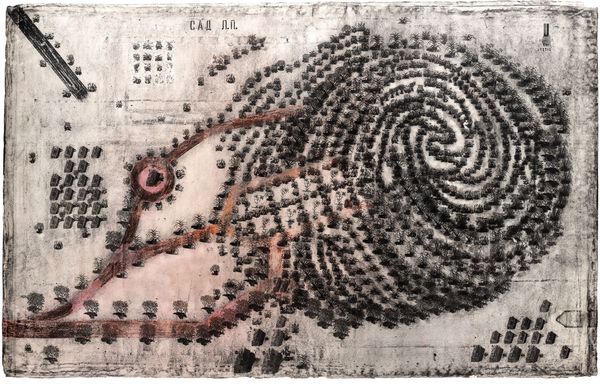 Pavlo Makov made this artwork, R.T. Garden, with an intriguing approach to mark-making that feels both systematic and organic. It’s as if the process itself is a meditation. Looking closely, the texture of the piece really grabs you. The surface isn’t smooth, it’s got this kind of gritty, almost dusty quality. The contrast of the dark marks against the pale background gives it a ghostly vibe. It makes me think about those images you see of crop circles. There's an area at the bottom left where the marks become denser and more chaotic. It reminds me of a garden that’s been left untended, wild and overgrown. There's something about the systematic nature of the marks in this piece, arranged in concentric circles, that makes me think of Vija Celmins' meticulous renderings of natural phenomena. But while Celmins is all about precision, Makov embraces imperfection and ambiguity. It’s art that invites you to get lost in its layers and find your own way.