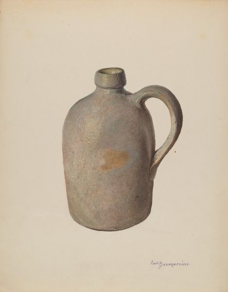 Curator: I find this unassuming drawing rather captivating, a work entitled "Jug" by Frank Fumagalli, rendered in watercolor around 1938. Editor: Immediately, I’m struck by the utter quiet of this jug. It seems to radiate stillness. The muted color palette and solitary presentation imbue it with a sense of reflection, a vessel of withheld stories. Curator: Well, a vessel of withheld stories can be very resonant considering that this ceramic jug, divorced from context, speaks volumes about domesticity during the Great Depression. Mass production was transforming daily life, yet there's something comforting in this seemingly commonplace object depicted through the intimate medium of watercolor. Perhaps its unassuming nature critiques that transformation. Editor: You make an interesting point. Notice how the artist meticulously captured the tonal qualities of the pottery. The handle, that beautiful curve – it's not just functional; it seems almost anthropomorphic, like a small, watchful arm. This treatment elevates it beyond a simple water holder. Could it suggest a yearning for stability during a period of intense socioeconomic volatility? Curator: Absolutely. By bestowing attention upon this single, modest vessel, Fumagalli acknowledges the resilience of the individual in the face of massive systemic shifts. Its imperfections, rendered so realistically by the watercolor technique, become signifiers of humanity – of labour and of endurance. There’s a social narrative embedded here that connects to the people's grit of the era. Editor: Yes, I’d agree. Beyond the socio-historical lens, however, I perceive how a seemingly unadorned object can mirror deeply personal and individual experiences. Like many symbols used across cultures, this object implies shelter, provision, nourishment, and community through that central image of an urn shape – connecting back to the past. Curator: Exactly. By focusing on the beauty of such a modest object Fumagalli, I believe, makes an unspoken but powerful case for honouring what persists. Editor: An invitation, if you will, to discover the profound within the ordinary. To look beneath the calm and reflect on the human experience, not unlike what is reflected within the belly of the jug.