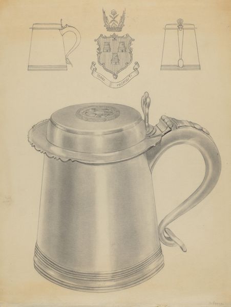Editor: This is Clayton Braun’s “Silver Tankard,” a pencil drawing from around 1936. I’m struck by the old engraving style… it reminds me of something you’d see illustrating a classic novel. What stands out to you in this piece? Curator: Well, I’m immediately drawn to the object itself: a tankard. Throughout history, drinking vessels have served not only a functional purpose but also a symbolic one. The tankard, often associated with gatherings, celebrations, and perhaps even camaraderie, carries a lot of cultural weight. It prompts a kind of visual and historical investigation, doesn’t it? Editor: Absolutely. So, beyond the object itself, what about Braun's artistic choices? Curator: Notice how Braun presents these secondary sketches of the object alongside the main one. These studies suggest a focus on understanding and capturing the object's essence from different angles and perhaps to show how it might operate. The crosshatching and subtle shading seem intended to capture the reflective qualities of the silver itself. Almost alchemical. What do you make of that heavy handle? Editor: The handle, with its ornate detail, suggests something more than mere functionality; maybe social status. It transforms a simple drinking vessel into an object of prestige. Curator: Exactly. And that speaks volumes. In what other ways does this specific form, the tankard, act as a visual metaphor for cultural continuity? Editor: Perhaps it symbolizes tradition, a kind of steadfastness. It makes me think about rituals that involve sharing a drink. Curator: Precisely. Consider how something as simple as a drinking vessel can tell us so much about our shared past and even inform our present understanding of social connections. The pencil work reminds us of the artist's labor and focus. Editor: I see how looking at the tankard itself as a symbol, opens up a whole new way of understanding the drawing! Curator: It’s amazing how a seemingly simple image can be a doorway into layers of meaning and cultural memory, isn't it?