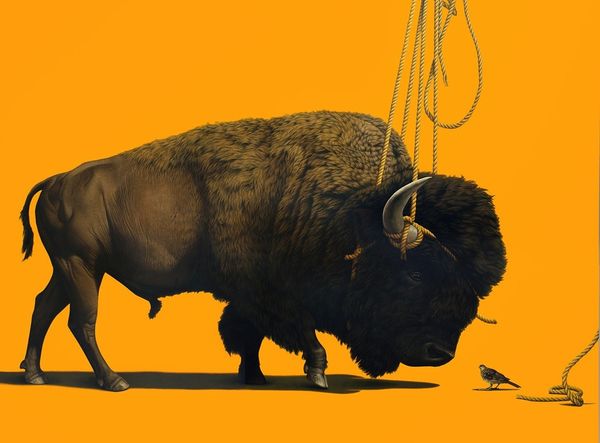 Julie Bell painted ‘Champion,’ showing a close view of a bison, a figure often used to symbolize the American West. Bell, known for her fantasy and figurative art, brings a unique lens to this subject. The bison stands as a powerful emblem, carrying the weight of cultural and ecological history. Once central to the lives of many Indigenous peoples, providing food, shelter, and spiritual sustenance, their near extinction represents a tragic collision of cultures and ecological devastation. ‘Champion’ captures the animal’s physical strength, yet also hints at a deeper, more complex narrative of survival and resilience. Bell’s choice to portray the bison through a heroic lens prompts reflection on themes of loss, endurance, and the shifting narratives of the American landscape. The painting invites us to consider the legacy of these majestic animals and their intricate connection to the land.
