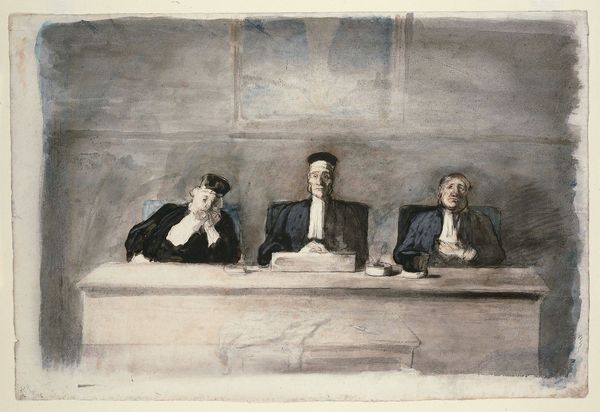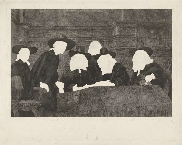 Editor: This print, titled "Kerkgangers en een misdienaar in de kerk," or "Churchgoers and a Server in Church," by Auguste Danse, dates back to 1880. It’s rendered in etching. It evokes a solemn and slightly somber mood. The composition feels very formal. What do you see in this piece? Curator: Immediately, I’m struck by the arrangement, this frieze-like presentation. Six men in dark clothing line the back, almost like judges, while a lone figure in white sits beneath them, a visual emphasis of innocence or perhaps vulnerability. Does the child's white garment carry a specific symbolic weight in your eyes? Editor: I hadn’t considered that…White often signifies purity, but vulnerability too, as you mentioned. The contrast is quite stark, especially since all the other figures wear dark clothes. Curator: Indeed. Now, notice the architectural details – are they merely backdrops, or do they amplify a certain feeling? The setting feels formal, steeped in tradition. Etching lends itself to capturing these precise, linear elements. Editor: I think it adds to the sense of importance, almost like we're witnessing some sort of ritual or established practice. It's very orderly and structured, yet there's something intimate about it. It makes me wonder about the stories behind these individuals. Curator: Absolutely. The symbolism goes beyond mere representation; it taps into shared cultural memory of societal structure. What have you gathered, now, about the power of symbolic composition after exploring this piece? Editor: I understand now how every visual element contributes to meaning, that the arrangement of figures and details work together to communicate social or spiritual themes. Thanks. Curator: It's been my pleasure. Each artwork contains many layers, just waiting to be unveiled.