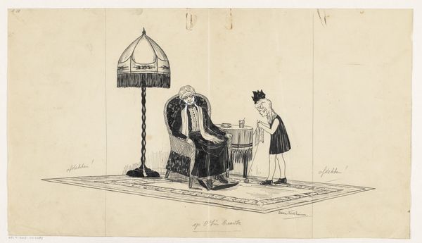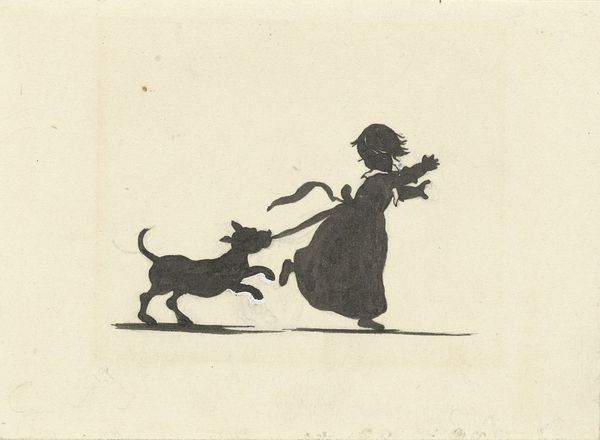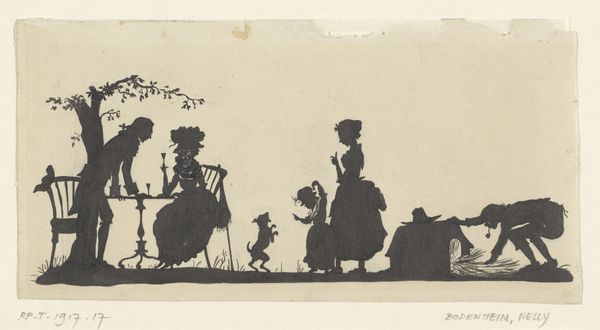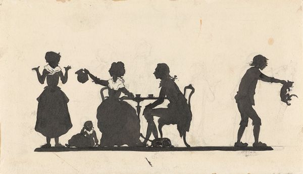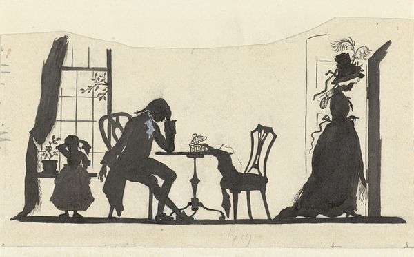Editor: This is "Ontwerp voor In Holland staat een Huis: silhouetten van een musicerend paar en de meid die op het kind past," by Nelly Bodenheim, probably made sometime between 1884 and 1917. It’s an ink drawing on paper. What strikes me most is the quirky, almost cartoonish feel of the silhouettes. What do you make of it? Curator: Well, for me, it's like stumbling upon a little theatrical performance frozen in time. There's the performing couple—lost in their music and oblivious to everything around them. The maidservant, seemingly worlds away, and then there is a toddler and even what seems to be a toy on the chair, connected through the little toy to be part of the world in general. Almost as if the artist has snipped a piece of time to create the drawing. Don't you feel a disconnect, even if everything happens within the frame of this drawing? Editor: I see what you mean. The couple is so refined, almost detached, while the maid and child seem more grounded. Do you think that says something about class distinctions at the time? Curator: It could. Bodenheim was quite astute. I find these small drawings really full of thoughts. We, perhaps unconsciously, look for divisions among people, and in the division the link emerges; something they all have in common – a child and a house, though in a slightly odd fashion. It's this little spark of unity and daily life, even in separate silhouetted worlds. Do you feel anything humorous when you look at this drawing? Editor: Definitely! The stiffness of the figures, almost like paper dolls, combined with their serious activities, creates a kind of lighthearted contrast. It’s charming. I didn’t expect to find so much complexity in a seemingly simple silhouette. Curator: Exactly! Art often hides its most interesting ideas in plain sight. Sometimes, the simpler the method, the more the viewer can dive into what's actually going on. Editor: This makes me want to explore more silhouette art now. There is something captivating about capturing the essence of something. Curator: I’d say your instincts are spot on! It also goes to show how much a single line, or in this case, the absence of one filled with ink, can express.