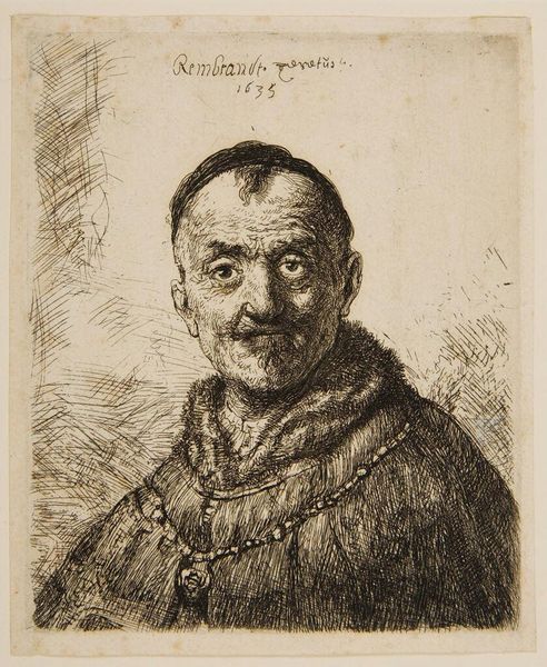 Curator: Isn't this portrait by Rembrandt, entitled "The First Oriental Head," just magnetic? I'm completely drawn in! It's an etching dating back to 1635. You can see it currently on display here at The Art Institute of Chicago. What are your immediate impressions? Editor: It's got a certain gravitas, doesn't it? All those lines digging into the paper; they speak of wisdom etched by time and experience, though perhaps a touch world-weary. What do you make of the ‘Oriental Head’ designation? Curator: Right? The detail for such a relatively small piece is mind-blowing. You can see every crinkle around his eyes! I find the name slightly puzzling, actually. Today, the term "oriental" is considered antiquated, and in the context of 17th-century Dutch art, it speaks volumes about the contemporary European understanding – or misunderstanding – of the "East." The exoticization, right? It's clearly not just a neutral descriptor. It really sparks a question, what kind of story did Rembrandt wish to weave around the portrayed person. Editor: It does highlight that power dynamic. Maybe it isn't a simple record of appearance, but an early modern construction of identity, using clothes and accessories to present a specific "Eastern" figure for a European audience, very powerful, as these images, symbols, even stereotypes linger in our collective consciousness for centuries. Curator: It's precisely that tension I love! On the one hand, the sheer skill with which Rembrandt renders the face gives this figure a kind of eternal, individualized humanity. On the other, the title anchors him to a specific, and somewhat stereotyped, category. That juxtaposition… it forces you to look closer, think deeper about how we see, classify, and maybe, misinterpret others. What do you make of the fur mantle and chain, what do you see beyond mere orientalism? Editor: They’re markers of status. A kind of stage dressing—but this figure remains enigmatic despite such clues. It’s fascinating how an image from so long ago can still prompt so many questions about representation and identity even today. Perhaps the 'Oriental Head' is more of a mirror, reflecting the perceptions of Rembrandt's time back at us. It asks as much about who is watching the portrait as it does about the subject being watched. Curator: Definitely. And that’s where the continued power of Rembrandt resides. Even when his titles feel a little off-key, his artistry tunes us into the deeper questions about ourselves and the world around us. It leaves an echo, long after we've walked away. Editor: A contemplative, sometimes unsettling echo of historical curiosity and artistic reflection, all condensed into a deceptively simple-seeming portrait.