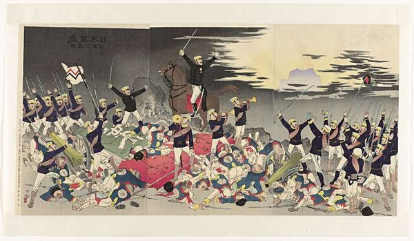 Ogata Gekko created this woodblock print depicting the Sino-Japanese War in Pyongyang. The stark imagery of combat evokes a raw emotional response. Observe how the figures are caught mid-action, frozen in a chaotic ballet of violence. The fallen soldiers, their bodies contorted, remind us of similar motifs in Renaissance battle scenes. This motif can be traced back to classical depictions of fallen warriors, echoing through time and resurfacing even in modern photography of war. This is a potent reminder of humanity's enduring struggle with conflict. The psychological impact of such images lies in their ability to tap into our collective memory of aggression and mortality. The repetition of this symbol throughout history shows our continued effort to grapple with the darker aspects of human nature. This cyclical nature of violence shows its continuous resurfacing and evolution in new contexts.