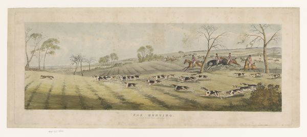 Curator: This watercolor from 1841, titled "Meute beagles jaagt op een haas," attributed to Thomas Sutherland, bursts with kinetic energy. What's your initial impression? Editor: Chaotic elegance, maybe? There’s an undeniable flurry of motion, but the restricted palette, those muted greens and browns, reins it in. It seems meticulously staged in terms of its making, almost like a play set for wealthy owners of hounds. Curator: Indeed. The repetition of the dogs, the rhythm of their strides... it speaks to the ritual of the hunt. Hunting scenes often symbolized power, the elite’s dominion over nature and, by extension, society. Editor: I wonder about the labour. Watercolors were quicker to produce and relatively easily replicable as prints. So who made this image? And for what audience? The clean lines and efficient use of materials indicate the artist probably made other hunting scene prints, given the level of expertise, the economy of line. Curator: It is interesting you raise that point, this reflects Romanticism, too, I feel. While showing a seemingly idyllic, rural scene, the very act depicted hints at a disruption of natural order, which elicits strong feelings among audiences over time, both for and against the elite landowners engaging in bloodsports. Editor: The artist creates an industry, or perhaps is simply an artisan fulfilling his patrons’ needs, a skilled manufacturer creating consumable images, and therefore memories. I'm also intrigued by how the relatively loose application of watercolor gives a real sense of movement. Curator: I see layers here, too. Not just the physical layers of paint on paper, but symbolic ones as well. The hare itself, small and vulnerable, represents perhaps innocence and fragility versus brute strength and the predetermined cycle of fate. Editor: Considering its medium, the portability of the resulting art suggests it's not only an image for the manor house but a transferable record, maybe circulated among participants and kept, reflecting back at themselves. The hunt immortalized. Curator: The chase depicted in full flow captured with great precision; the eye really is led to the back of the composition with the additional riders on the ridge line! The encoding, both in symbolism and in labor, truly shapes our modern perceptions. Editor: Well said.