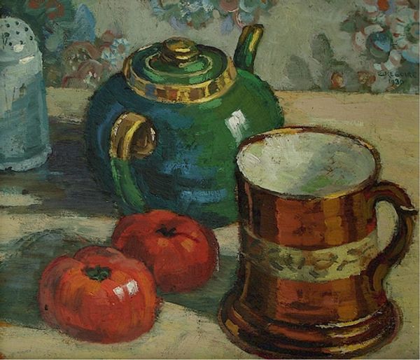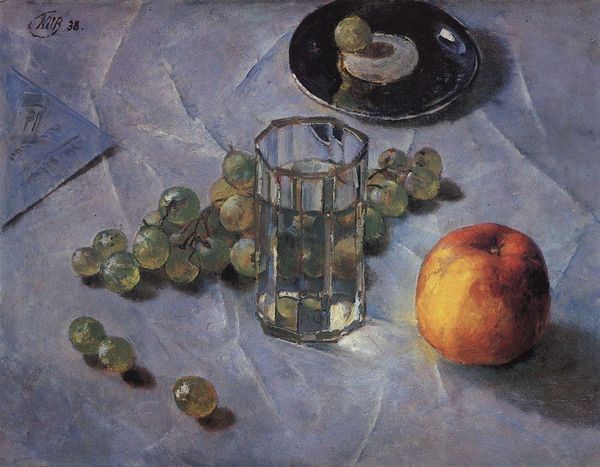 Curator: Oh, I do love how solid those apples look. Konstantin Gorbatov painted this still life in 1913, capturing these humble objects with an Impressionistic style, all soft brushstrokes in oil paint. Editor: My first thought is about light; isn't it odd? It feels cool, almost artificial, as though illuminating objects in a stage scene and stripping them of vitality. Curator: Well, I would say it gives them a certain…weight. He builds the composition with the darker tones, the blues and greens lurking behind the fruit, letting the apples push forward into the light. Editor: Pushes forward to where, exactly? There's something almost forlorn about the staging, these isolated objects on what looks like a carelessly strewn cloth, creating the space of art history when Russia was quickly mobilizing for war, so even innocuous fruit suggests a certain elegiac tone? Curator: (chuckles) See, I just see good autumn apples ripe for picking! Though, thinking of history, Gorbatov eventually had to flee Russia after the Revolution and settle in Italy… Perhaps even the choice of an archetypal still life, a classical subject, has some coded resistance. Editor: Interesting. I notice too how he almost merges the background and the vessels into this uniform greenish haze. They seem like supporting characters overshadowed by these very symbolic red fruits, which can represent knowledge, sin, or, dare I say, simply abundance! Curator: Exactly, the simple joy of an apple! There's a directness in his work that feels grounded, particularly given the shifting art world of the early 20th century. Though influenced by Impressionism, Gorbatov maintains his uniquely straightforward aesthetic. Editor: You're right. Maybe it’s not about sorrow as such but about the fleeting beauty of tangible, simple things, elevated and maybe memorialized, given the tumultuous world that these objects were being produced in. The subtle, expressive qualities and emotional power is more apparent when put into the historical context. Curator: Right, right. Beauty caught, preserved for another glance. Maybe that is his statement. Thanks! Editor: My pleasure, it is important to remember to see beyond the still object into the artist's life.