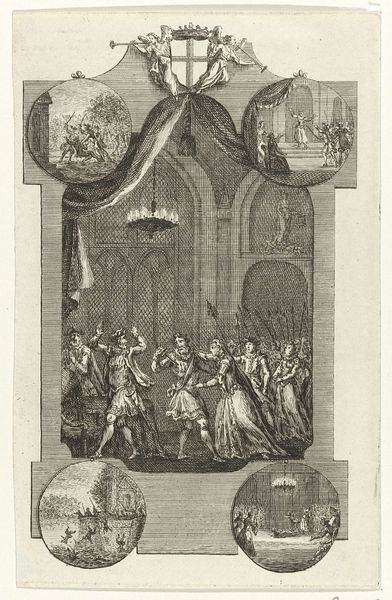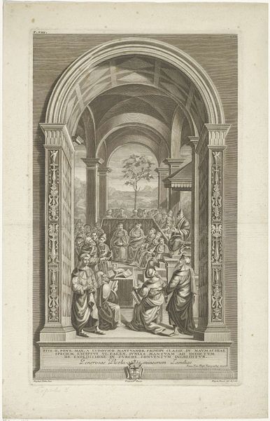 This etching by François van Bleyswijck presents a cityscape of Utrecht framed by allegorical figures. The detailed lines and composition invite us to decode its symbolic structure. The upper register shows the Domkerk of Utrecht as the focal point, rendered with meticulous architectural detail. This cityscape is arched by figures of Minerva and other virtues, who signify wisdom and moral excellence. The entire scene is visually supported by a base filled with classical figures. Each element is carefully placed to construct a visual hierarchy that guides our reading of the image. We can interpret the cityscape as a signifier of civic pride and the virtues as symbols of an ideal society. The artist employs semiotic codes to communicate a vision of order and moral values, essential to 18th-century Dutch society. Note the balance between realism and allegory. This interplay suggests that the city's physical space and its societal values are intertwined. This formal arrangement encourages us to reflect on the relationship between space, morality, and the ideal city.