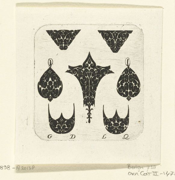 Claes Jansz. Visscher created this blackwork print with two horizontal panels and four bezels, sometime in the early 17th century. During this era, the Dutch Republic was experiencing a golden age of trade and cultural exchange, which also saw the rise of the middle class. These ornamental designs, made in black ink, are reflective of the decorative arts that were becoming increasingly accessible to a wider segment of society. The patterns suggest an emerging interest in aesthetics and personalized expression. The symmetry and classical motifs point to a culture that was attempting to reconcile tradition with the desire for new forms of identity and status. This print offered patterns for artisans to use in creating luxury goods, catering to a society eager to display its prosperity through refined and artistic embellishments. While seemingly simple, this print encapsulates the cultural values of an era defined by exploration, economic growth, and an evolving sense of self.