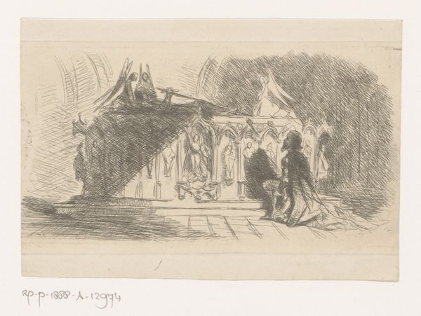 Gustave Buschmann created this print, "Man Kneeling Before a Gothic Tomb," using etching techniques. Notice how the composition is structured around contrasts: light and shadow, stillness and detail. The tomb, shrouded in darkness on the left, emerges into clarity on the right. The kneeling man, a dark silhouette, directs our gaze towards the intricate carvings on the tomb. Buschmann employs line and texture to evoke a sense of solemnity. The dense, cross-hatched lines create deep shadows, while delicate lines define the architectural details and figures on the tomb. This contrast heightens the emotional impact, inviting contemplation on mortality and memory. The artwork destabilizes a fixed perception by playing with light and form. It encourages us to reflect on how meaning is constructed through visual relationships and artistic techniques.