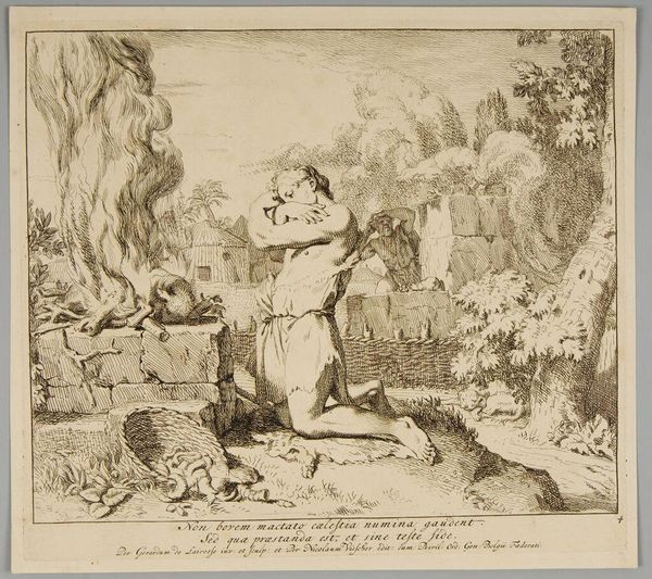 Editor: This is Gérard de Lairesse's "Remorses of Cain," an etching. The scene is unsettling, filled with violence and guilt. What narrative layers do you see in this depiction? Curator: It's powerful, isn't it? De Lairesse uses the Cain and Abel story to dissect societal anxieties around transgression, divine judgment, and fratricide. The burning offering, Abel's lifeless body, and Cain's weapon embody a rupture in patriarchal order. How might contemporary audiences interpret this exploration of moral decay? Editor: Perhaps as a reflection on cyclical violence and the burden of history? Curator: Precisely. Consider how gender dynamics play out here too – the absence of female figures underscores the narrative's focus on masculine aggression and accountability. Does it perhaps offer insights into modern societal structures? Editor: Definitely a lot to think about here, from a gendered perspective, and a modern point of view.