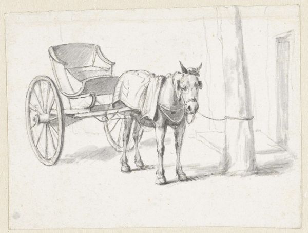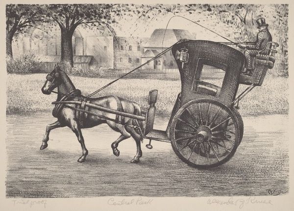 William Henry Shelton created this etching, "The One Hoss Shay," in 1889. The monochromatic image captures a horse-drawn carriage in motion, evoking a sense of rustic Americana. Shelton's formal approach hinges on the interplay between line and texture to create depth. The cross-hatching in the fields and foliage contrasts with the smoother areas of the sky, dividing the image into distinct zones. This division echoes a structuralist approach, setting up binary oppositions between nature and culture. The composition, particularly the angle of the horse and carriage, suggests a forward thrust that reflects the philosophical interest in dynamism and change prominent at the time. The rough texture and use of light and shadow contribute to a sense of realism, yet the print's stark contrasts also destabilize any straightforward representation, pushing viewers to question the relationship between what is depicted and how it is conveyed. Ultimately, Shelton's etching is a visual discourse that remains open to interpretation.