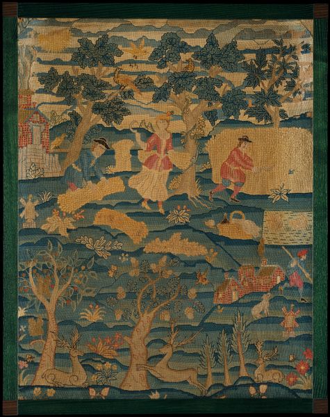 Editor: This is "Mughal Emperor Akbar Observing an Animal Combat," attributed to Miskin. What strikes me is the juxtaposition of violence and serenity. The animal fight contrasts sharply with the tranquil figures in the foreground. What do you see here? Curator: Indeed. The combat evokes the raw power associated with kingship, but the ascetics below represent spiritual authority. Notice how both are placed within the natural landscape. What does this say about Akbar's perception of his role, his power? Editor: I guess he saw himself as a ruler connected to both earthly and spiritual realms. Curator: Precisely. The image becomes a symbol of his complex identity. And the artist has constructed an enduring emblem of power in balance. Editor: That makes me look at it in a whole new light. Thanks!